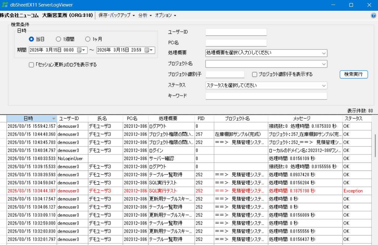 出力したい処理のところに ”SetSvr_UserLog” を挿入することにより、システム管理者はユーザーの操作ログを閲覧することができます。