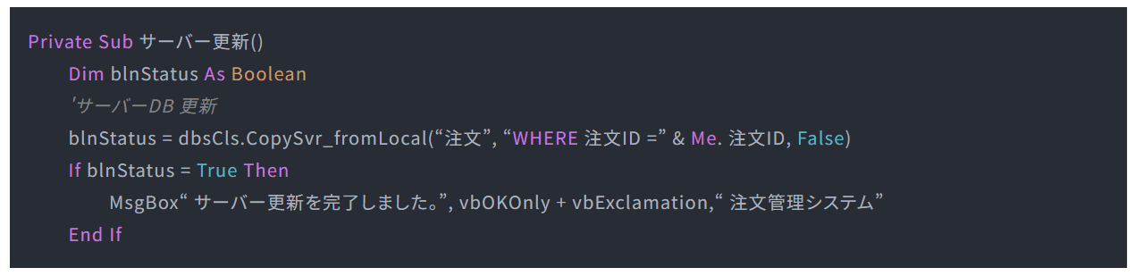 テーブル(注文)のレコードをクライアントPCのデータを元に、サーバーDBの更新データとして書き換えます。