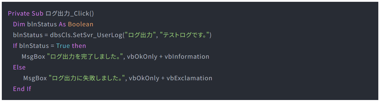ユーザーの操作履歴や処理内容をサーバー管理画面のログとして出力する場合のサンプルです。