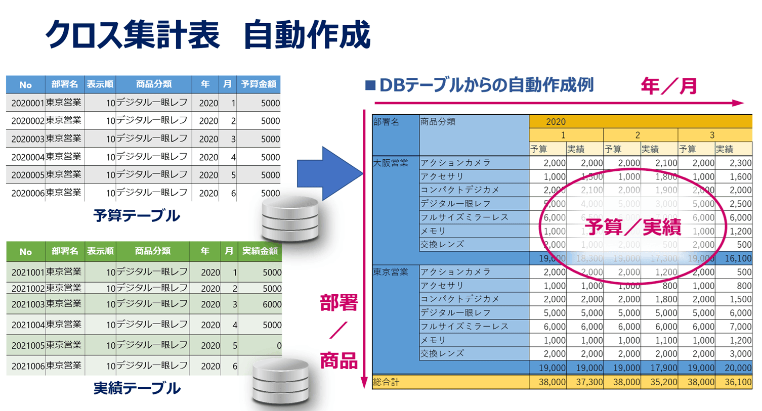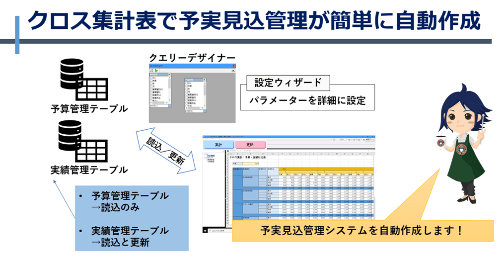 単なる集計表だけでなく、動作モードには①表示、②更新を選択できるため集計表に対して、明細データを変更してテーブルにデータを更新することが出来ます。