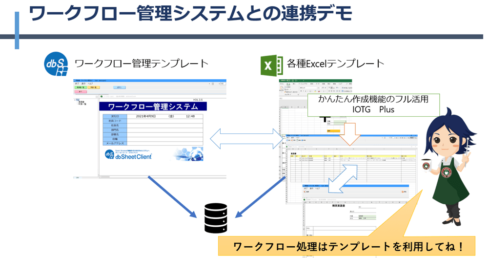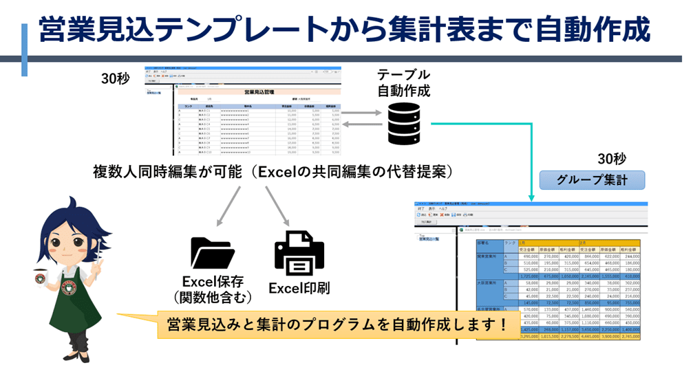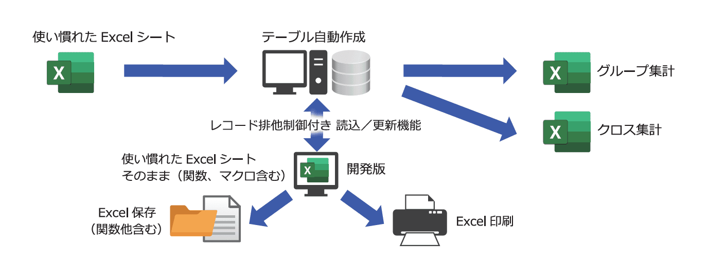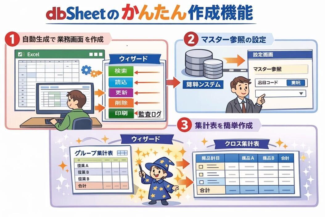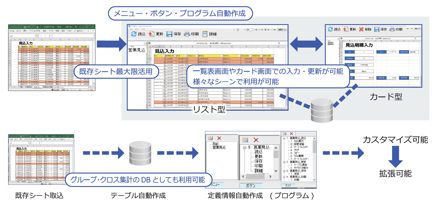 既存のExcelシートを元にして、ウィザード形式でデータベースやプログラム(メニュー/ボタン/タスク)を自動作成することで開発時間を大幅に削減出来ます。
