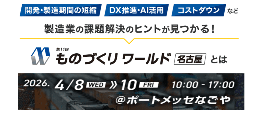 ものづくり ワールド [名古屋] は、IT、DX製品、部品、設備、装置、計測製品など、開発・製造期間の短縮、DX・IT化の推進、コストダウン、工場の省エネ・自動化に貢献する最新技術が約630社出展。(ものづくり ワールド [名古屋] 2026|中部最大級の製造業の展示会)