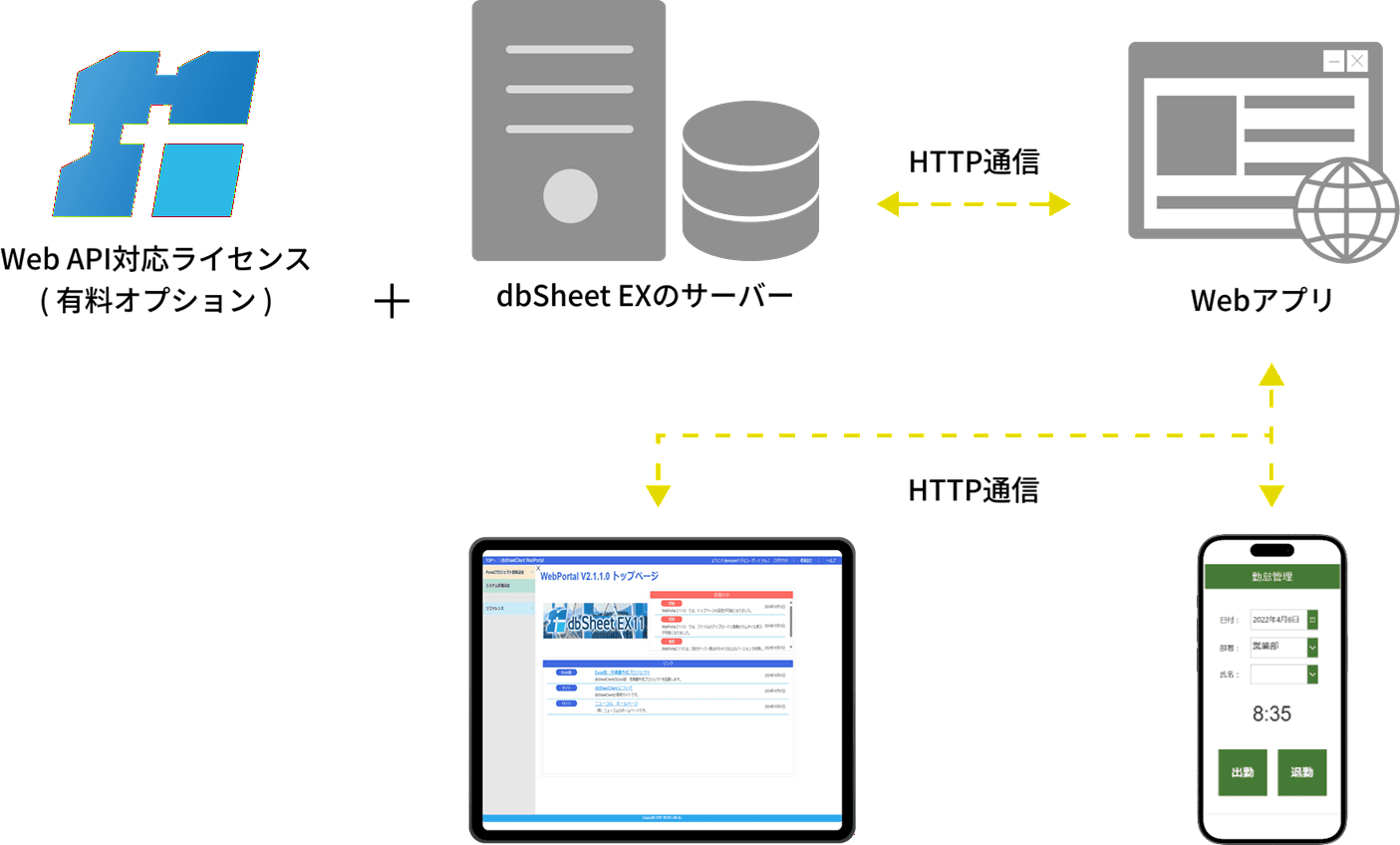 ※Web APIで作成されたプロジェクトの利用には、dbSheet EX実行版CALが必要です。(但し、Webアプリを利用するデバイスにdbSheet EX実行版のインストールは必要ありません。)
