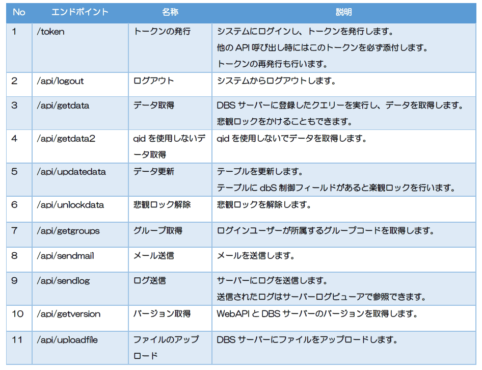 トークンの発行/ログオフ/データ取得/データ更新/悲観ロック解除/グループ取得/メール送信/ログ送信/バージョン取得