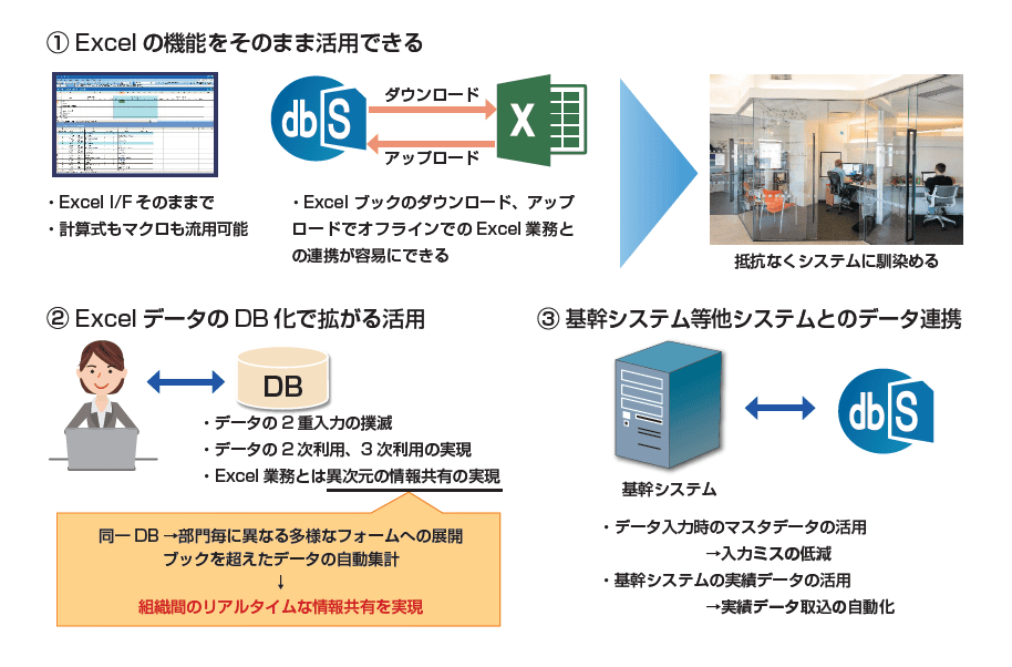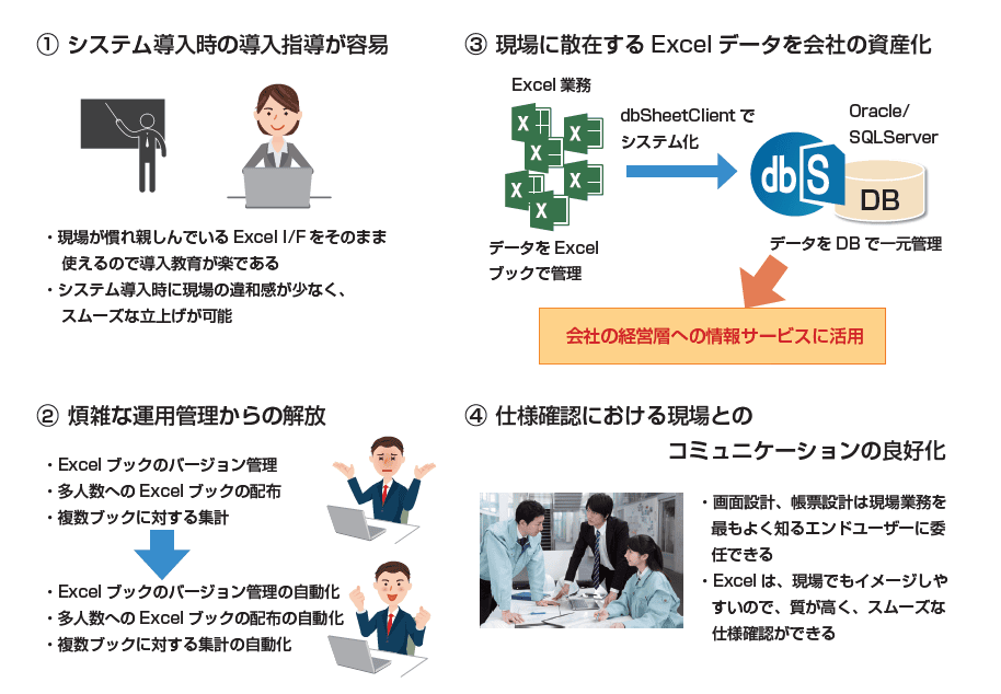dbSheetは、Excelの使いやすさを維持しながらDB管理と統制を実現し、情報システム部門の導入・運用・開発負担を大きく軽減する。